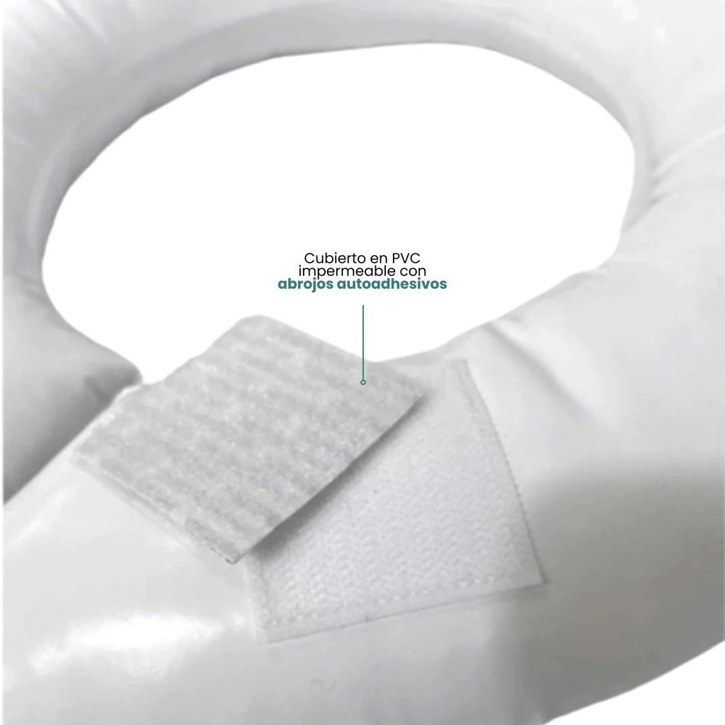Su confección de espuma de vellón siliconado, cubierto en PVC impermeable, e incluye abrojos autoadhesivos, indispensables para poder colocarlo y quitarlo cuando el paciente lo desee.
