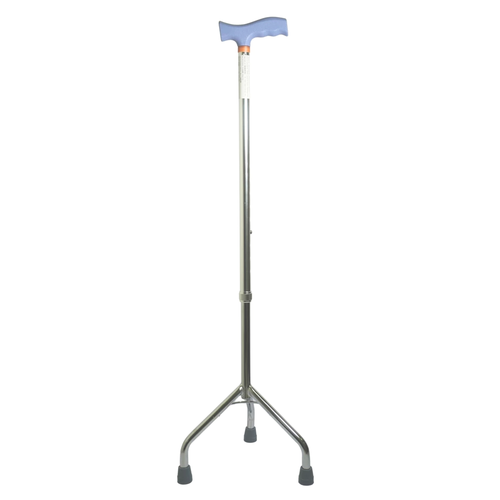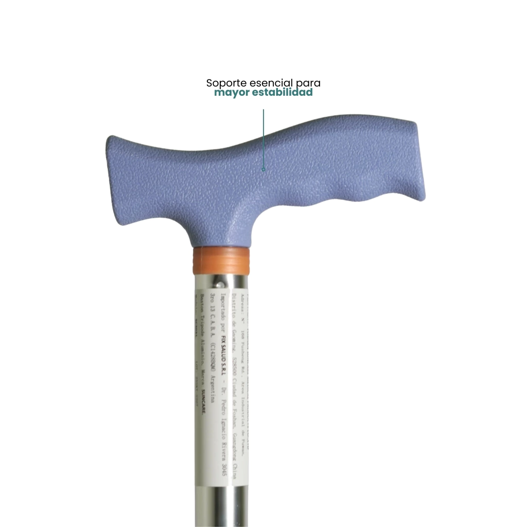 Material en aluminio anodizado. Fácilmente regulable en altura. Regatones anti-deslizantes. Mango en forma de T. Incluye una tira de sujeción e identificador con nombre y teléfono. La particularidad de este modelo es el material resistente en aluminio y puntas antideslizantes, con un trípode.