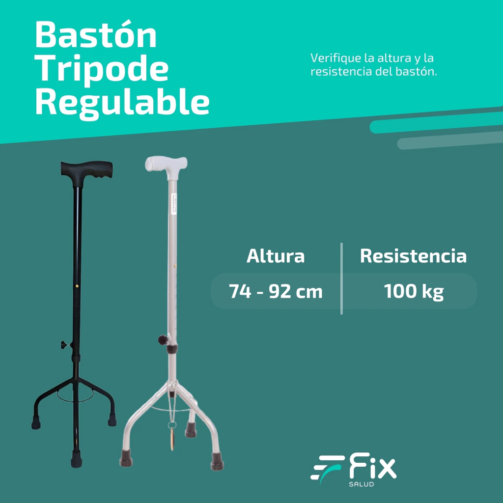 Cuenta con base trípode, puntas antideslizantes, regulación en altura, mango en forma de T, tira de sujeción e identificador con nombre y teléfono.