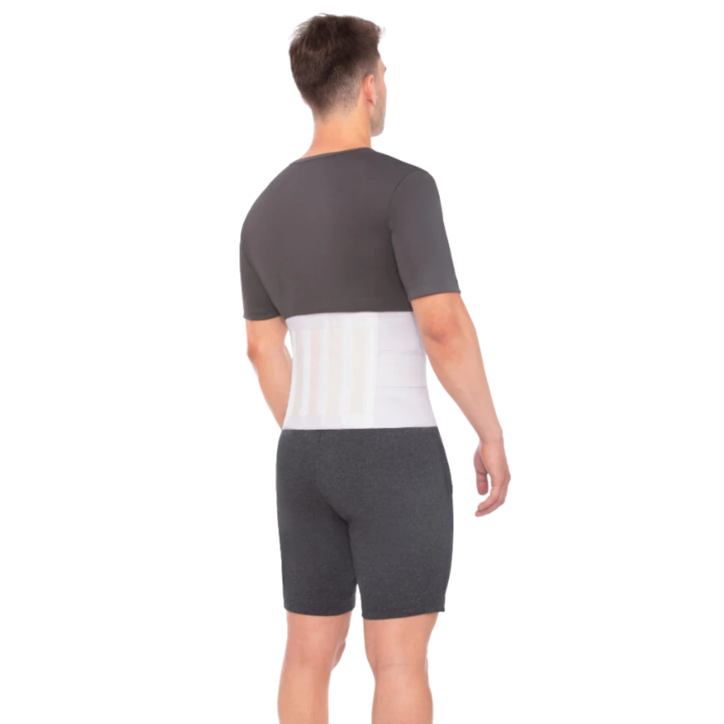 Ubicar la faja alrededor de la zona lumbar y las ballenas posicionadas en el centro. Sujetar el abrojo en el medio del abdomen. Cerrar la sobrebanda de contención.