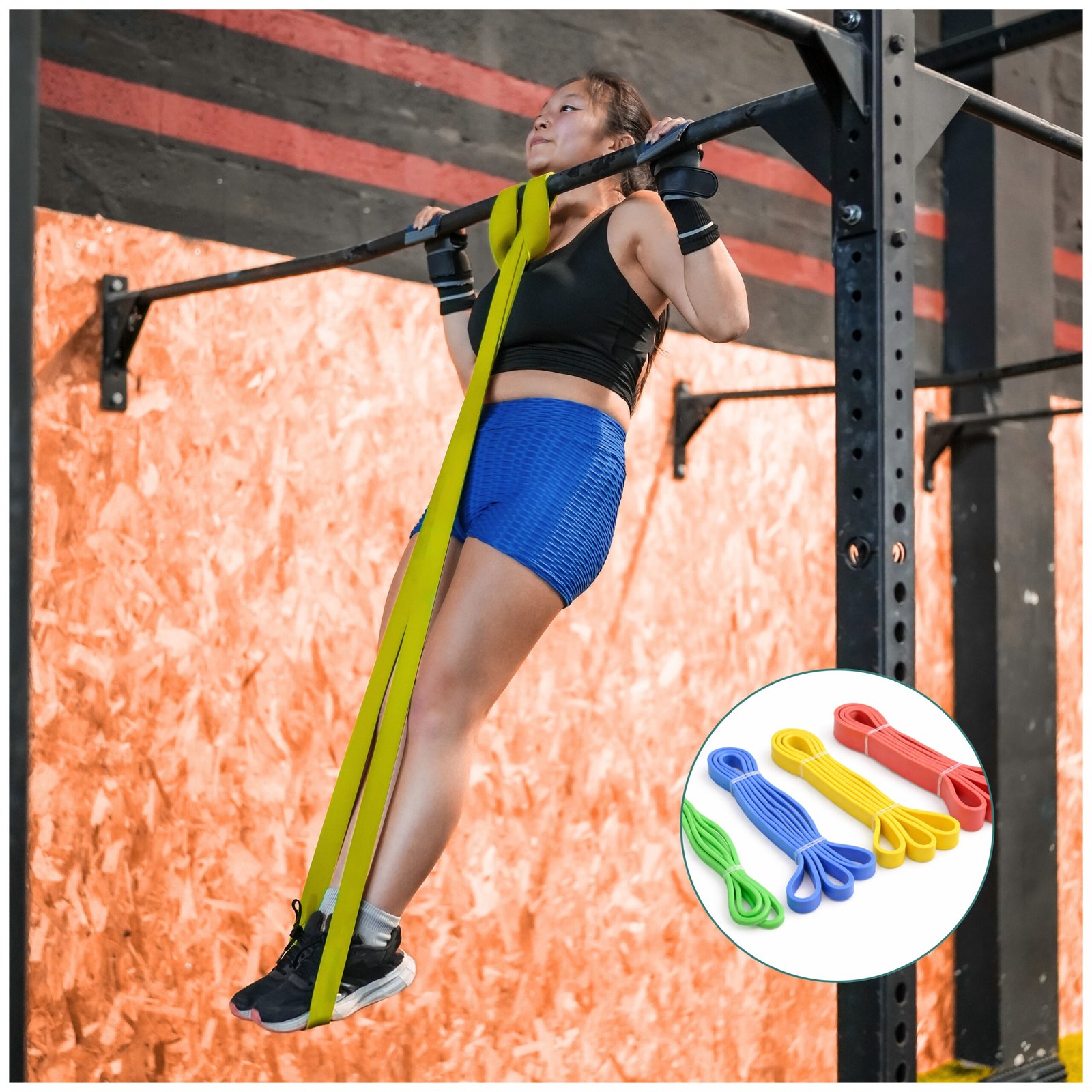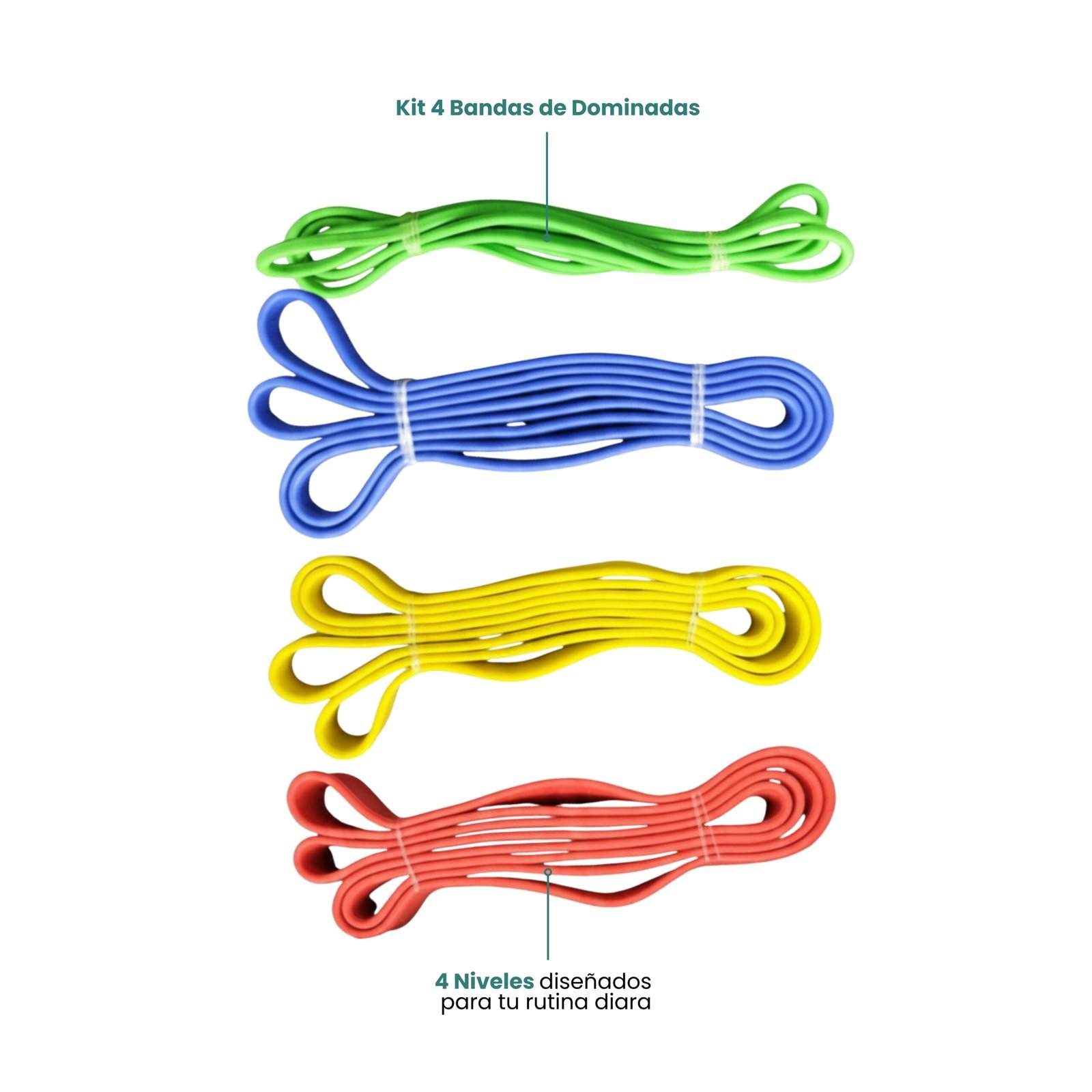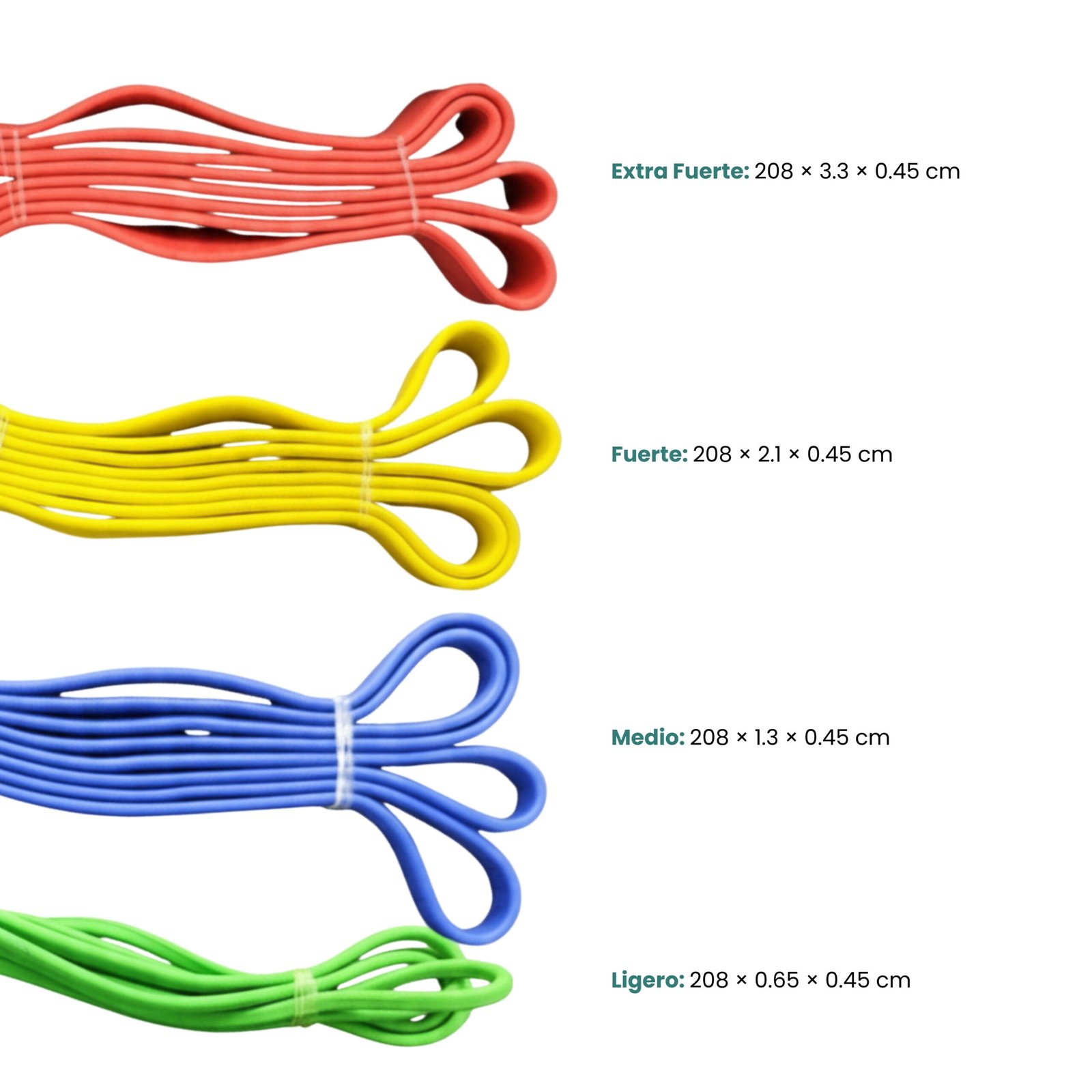Kit completo de 4 bandas elásticas de resistencia progresiva, ideal para asistir dominadas y potenciar entrenamientos de fuerza. Cada banda ofrece un nivel distinto de resistencia, permitiendo adaptarse a principiantes y usuarios avanzados.