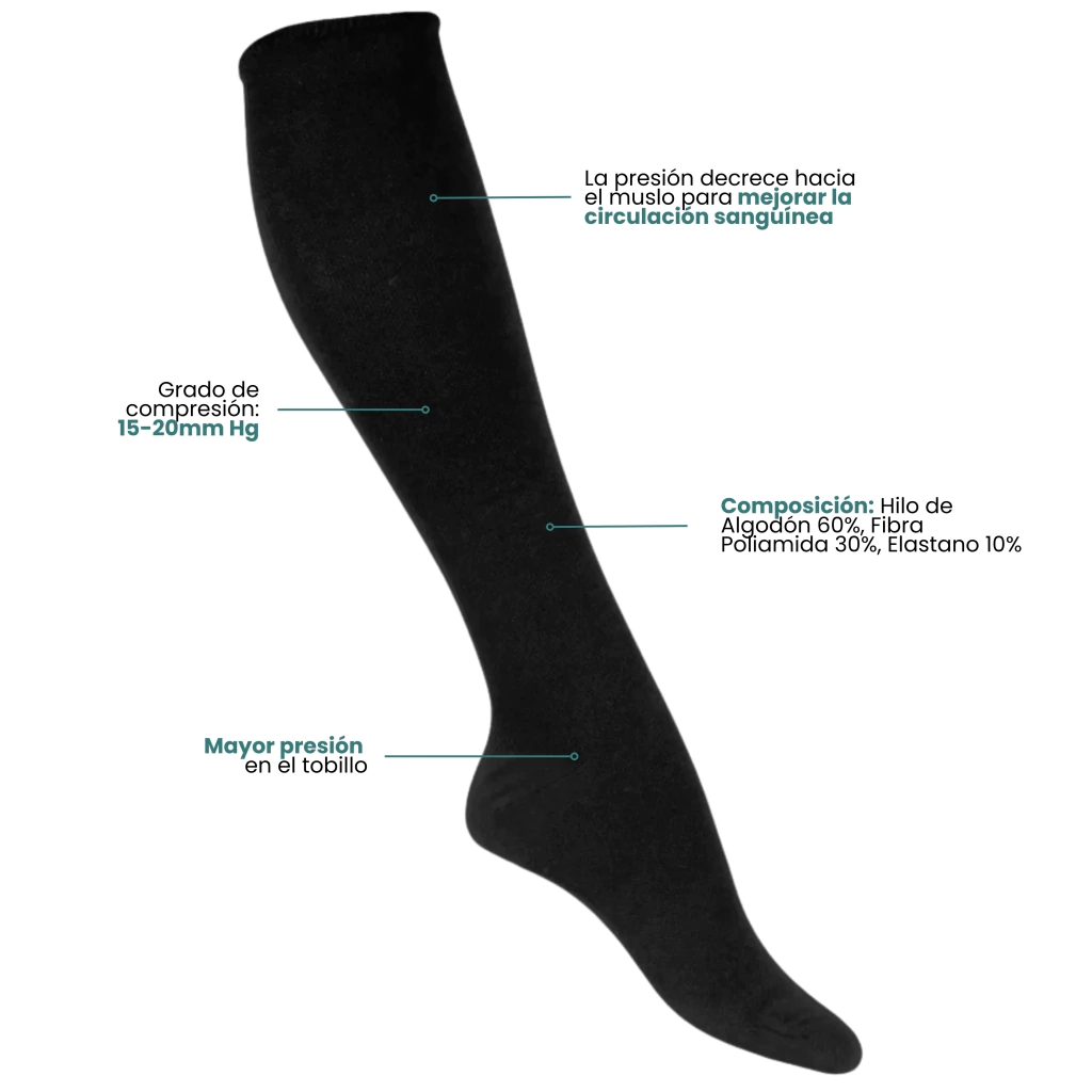 Estas medias cuentan con compresión graduada, aplicando mayor presión en el tobillo y disminuyendo hacia el muslo, lo que favorece la circulación sanguínea. Son recomendadas para personas con problemas de circulación, várices, celulitis, post cirugías, o en situaciones de viajes largos o trabajo que implique estar mucho tiempo de pie o sentado.