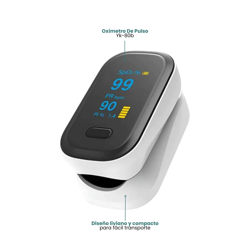 El oxímetro YK-80B permite medir con rapidez y exactitud la saturación de oxígeno (SpO2), la frecuencia del pulso y el índice de perfusión. Su pantalla OLED rotativa ofrece una lectura clara desde cualquier ángulo, y su diseño liviano y compacto lo hace ideal para uso profesional o doméstico.